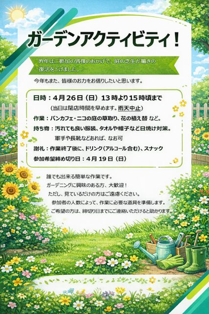 そこで去年に引き続き、皆さんと一緒にパンカフェ・ニコの庭の手入れを行いたいとと思います。